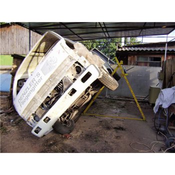 О сохранности нужно держать в голове с самых первых операций по установке машинки на опорные площадки опрокидывателя. До этого чем будут сняты колеса, машинка обязана быть заторможена стояночным тормозом, в коробке включена низшая передача, а под колесами, остающимися пока на земле, должны быть особые упоры-клинья. Конкретно упоры, а не случайные кирпичи, камешки либо палки.