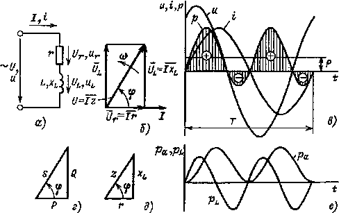 Рис. 2.9. Электронная цепь, содержащая катушку индуктивности r и L (а), ее векторная диаграмма (б), графики моментальных значений u, i, р (в), треугольники мощностей и сопротивлений (г, д), графики моментальных значений рa , pL (e) где ur = Imr sin ωt — напряжение на активном сопротивлении (активное напряжение), совпадающее по фазе с током; uL = ImxLsin (ωt + π/2) — напряжение на индуктивном сопротивлении (индуктивное напряжение), опережающее ток по фазе на 90°. На векторной диаграмме (рис. 2.9, б) вектор Ūr совпадает с вектором тока, а вектор ŪL опережает вектор тока на 90°. Из диаграммы следует, что вектор напряжения сети равен геометрической сумме векторов Ūr и ŪL: