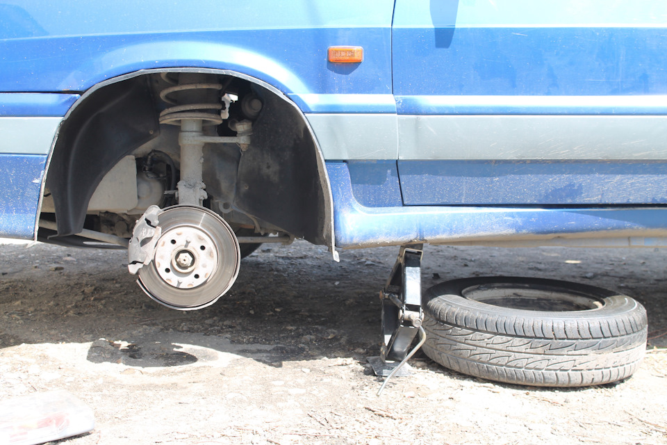 Срываем колёсные болты, подымаем машинку домкратом вывесив колесо, откручиваем его вполне и кидаем под машинку (для сохранности)))