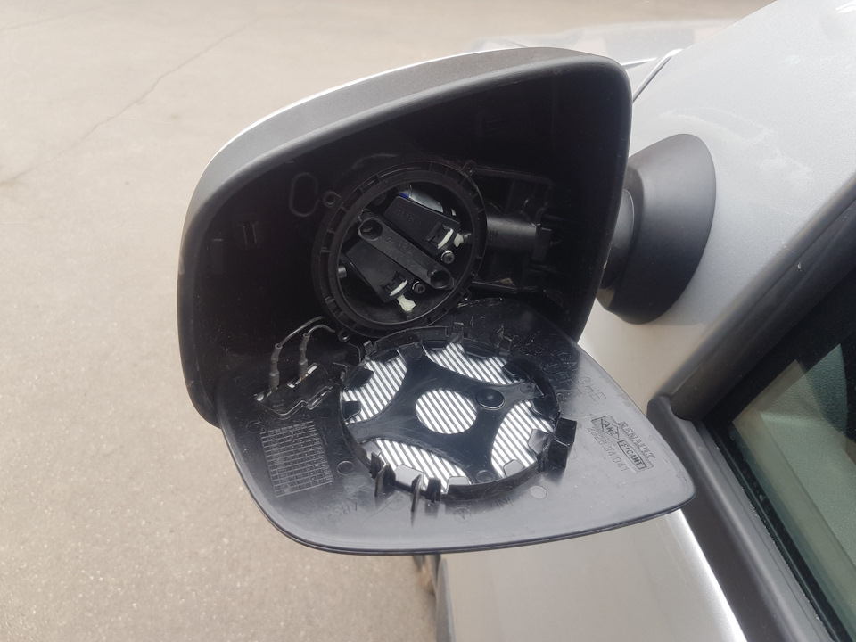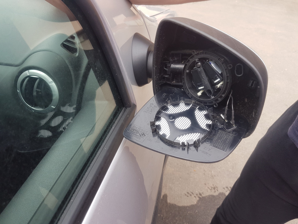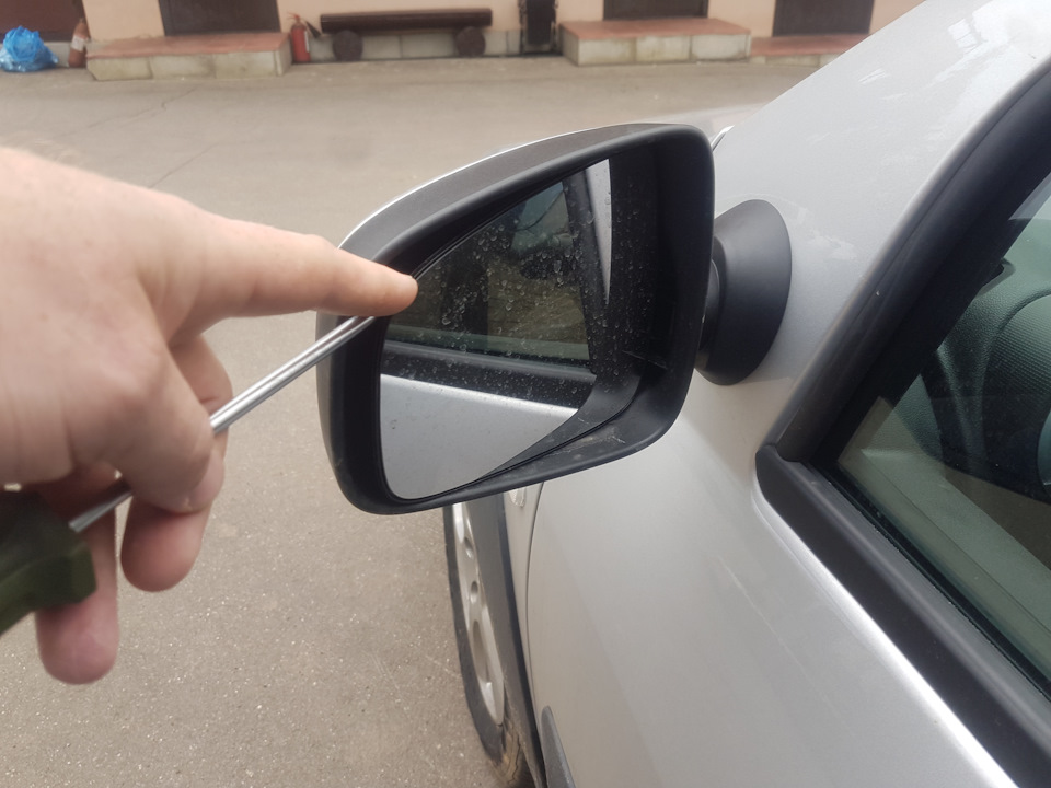 Зеркальный элемент отводим в хоть какое последнее положение. Дальше отвёрткой аккуратненько поддеваем и зеркало остаётся на проводах подогрева.