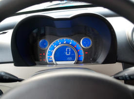 При ярчайшем вешнем солнце показания приборной панели видны плохо, и здесь нас настигло очередное разочарование – в машине нет регулировки яркости подсветки панели. В целом, приборная панель смотрится модно, но мало «игрушечно». Датчики размещаются на ней необычным образом. В центре «приборки» размещен большенный кругляш тахометра, снутри которого находится очередной круг – спидометр, выводящий показания скорости в цифровом виде. Слева и справа от тахометра размещаются показатель температуры мотора и уровня бензина соответственно.