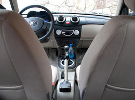 Старт дан, и мы бодро трогаемся, в салоне тихо, автомобильчик уверенно держит дорогу. Лобовое стекло с неплохим обзором, боковые стойки не ограничивают видимость. Фронтальные стеклоподъемники (всего их четыре) вполне утапливают боковые стекла в двери, в отличие от той же «Калины», у которой стекла опустить вполне нереально. К слову, вниз стекло опускается одним нажатием клавиши, а чтоб поднять его придется всегда держать палец на кнопочке.