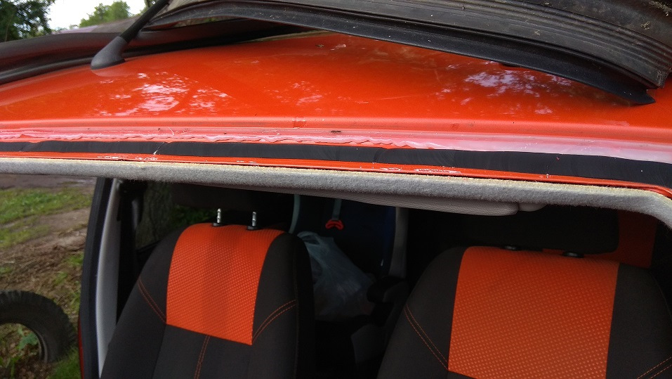Дальше установка на машинку без особенных сложностей. Положили, умеренно по глубине придавили, очень давить не нужно, а то позже тяжело срезать будет, зафиксировал к крыше несколькими полосами скотча, а снизу распер родными резиновыми ёлочками. Окна я заблаговременно открыл все, а дверьми не хлопал. В таком виде оставил её в гараже до утра. С утра пришел, по уже пройденной технологии залил верхний и боковые щели силиконовым нейтральным герметиком, установил на пространство жабо, поводки и новейшие дворники, обшивки стоек в салоне, повесил зеркало и оставил еще на день.