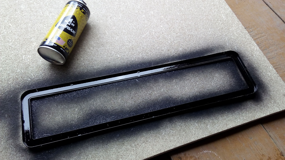 1. Поставил, за ранее покрашенную в темный матовый цвет, рамку номерного знака. Покупаю постоянно одну и ту же модель рамки на все машинки. Нравится ее форма и шероховатость, на которую отлично ложится краска из баллончика.