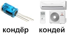 P.S. Конденсатор от кондюка отличал уже в 5-м классе, лет так практически 40 вспять.