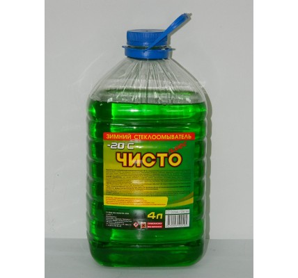 Жидкость для стеколоомывателя зимняя «Чисто Плюс». Температура замерзания до −20°С. Размер — 4 литра. Отлично смывает дорожную грязюка со стекол. Красивое соотношение стоимость/свойство.