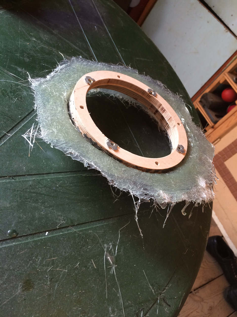 - Опосля этого избытки стеклоткани вырезаем, а при помощи той же шкурки устраняем подтеки от клея.