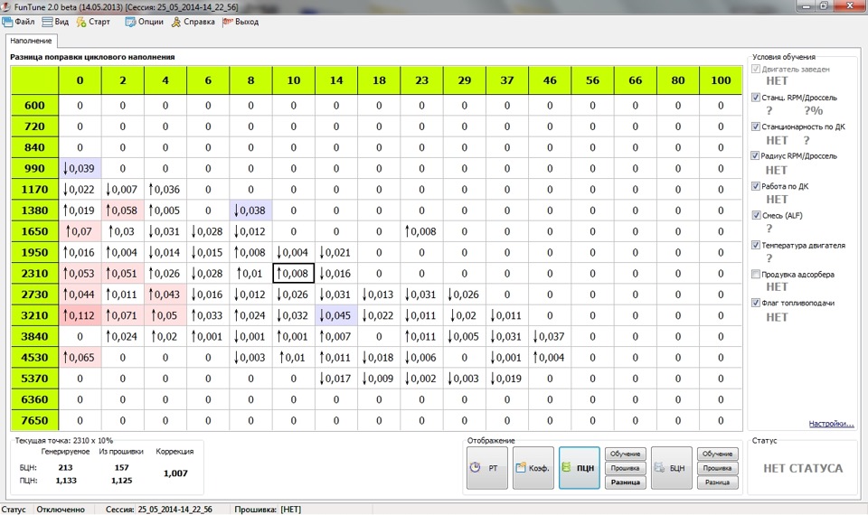 При помощи программки FuneTune и кабеля диагностики эти таблицы откатываются весьма хорошо. Программка глядит разницу циклового заполнения и строит свою таблицу. Проще говоря, в прошивке одни данные, в действительности на езде получаются остальные. Вот эти “ездовые” данные нам и нужно получить, сохранить и потом вставить в прошивку. Чем больше ездим в режиме обучения, чем поточнее выходит откатка и машинка позже начинает вваливать.