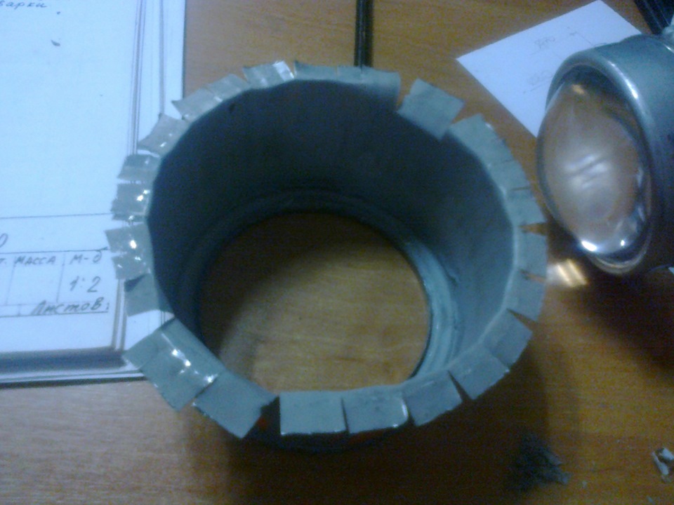 Для установки линз необходимы маски. От тех которые продают по размерам пришлось отрешиться, т.к. по высоте маска не обязана превосходить 20 мм. Если будет больше, то линза упрется в стекло. Мне в голову пришла мысль сколхозить маску из литровой банки из под грунтовки (эмали). Внешний поперечник банки составляет Ф101 мм., внутренний (там где горловина) – 79 мм. что как раз подступает для поперечника держателя линзы. Далее все происходило методом проб и ошибок. Резал банку понемногу, подрезал и подгонял по месту, основное чтоб линза не касалась стекла и не была перекошена относительно отражателя.