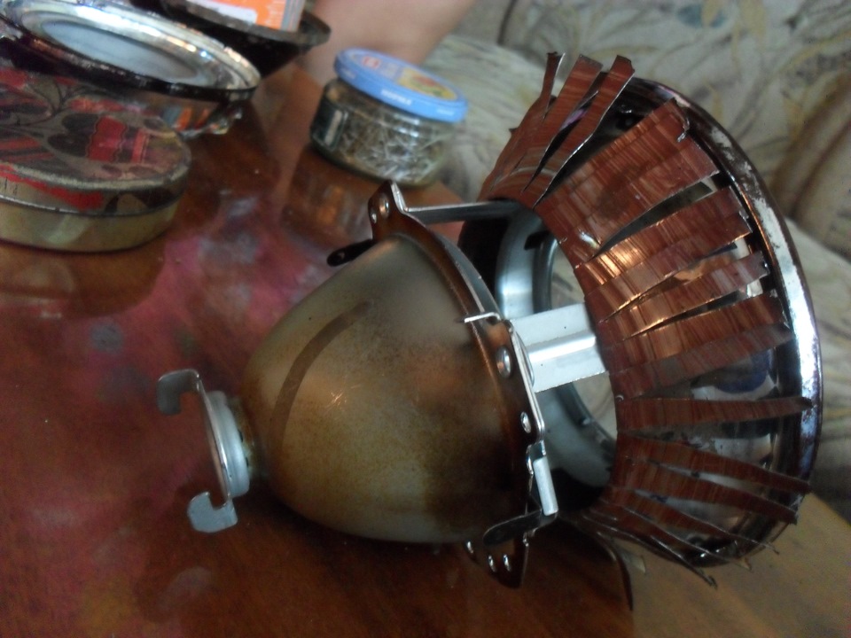 Когда размеры были подогнаны – завернул лепестки моих «масок» тем закрепил маску вокруг отражателя. Поперечник банки — 101 мм, а отверстие в отражателе – 90 мм. из-за данной разности выходит, что маска вроде бы завальцована вокруг отражателя. Стык пролил всепригодным клеем «Дракон», он заполнил выпуклости стыка. Красил темной матовой краской BOSNY.