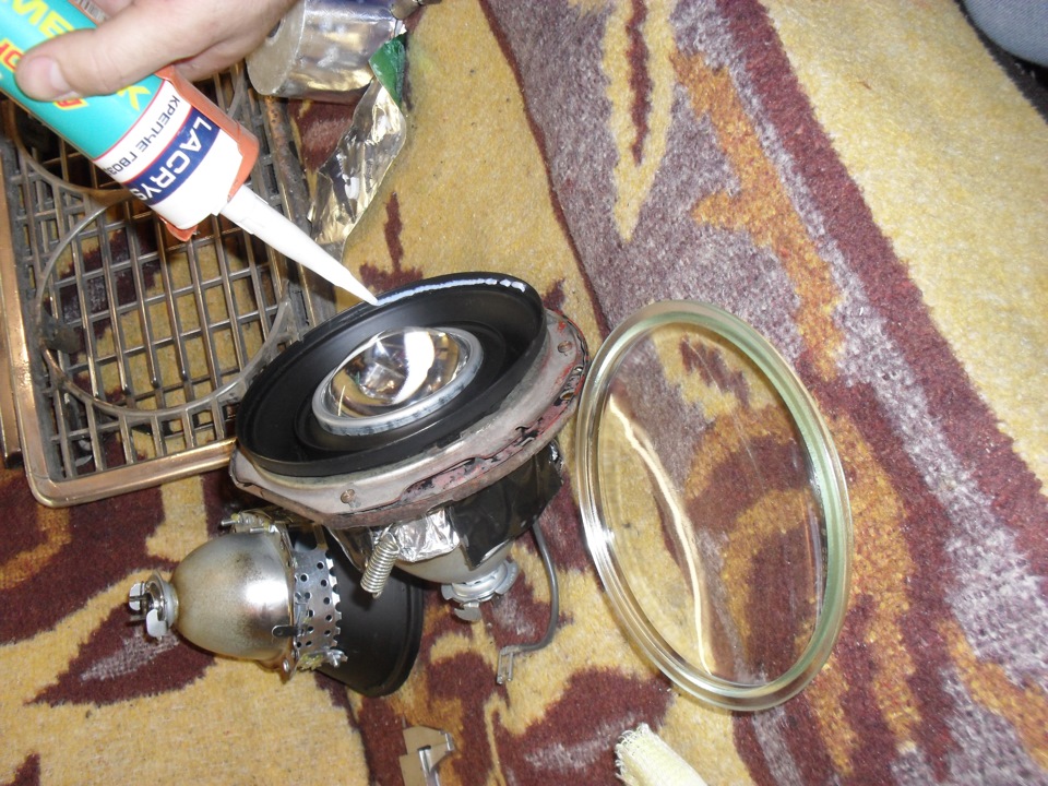 Опосля всей грязной работы пошла очистка от пыли и вклейка стекла. Гладкие стекла мне предоставил Васёк из Днепропетровска. Клеил на строительный герметик для стекла прозрачный. Промазал узким слоем посадочное в отражателе (много недозволено, т.к. вылезет за границы стекла вовнутрь – будет приметно) и позже опосля вставки стекла залил на сто процентов кромку (окантовку) для плотности шва.