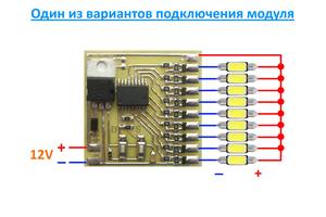 К данному контроллеру можно подключать до 9 светодиодов, ну либо до 9 цепочек светодиодов. Можно меньше. Транзисторы на контроллере стоят N-канальные, а это означает, что с тр.