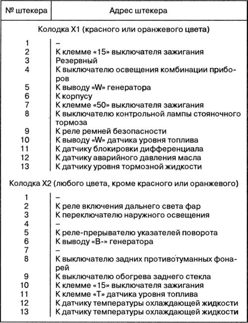В жгуте проводов панели устройств 2-ые концы белоснежных проводов сведены в одну точку, которая соединена с регулятором освещения устройств. 2-ые концы темных проводов также сведены в точку, соединенную с массой. 2-ые концы желтоватых проводов с голубой полосой сведены в точку, соединенную с выводом «А» основного блока предохранителей. И 2-ые концы оранжевых проводов тоже сведены в точку, соединенную с выводом «Б» основного блока предохранителей.