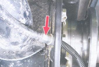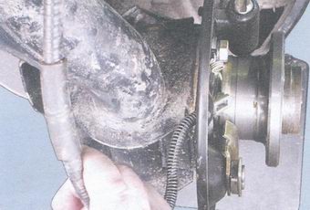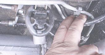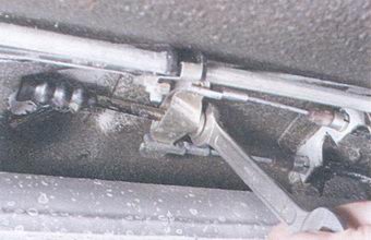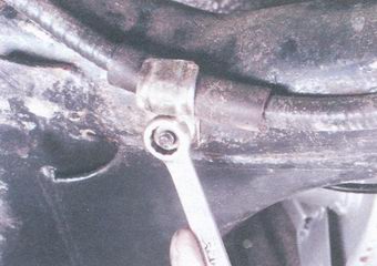 - Сейчас отворачиваем болт крепления оболочки троса к опоре задней подвески.