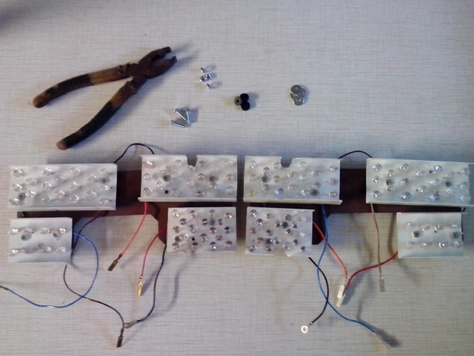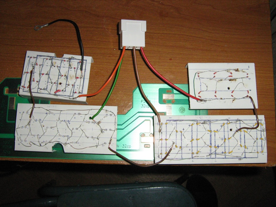 Сама система панели — 4 светодиода, соединенных поочередно (горизонтальные линейки), любая линия имеет свой резистор (180 Ом / 0,25 Вт) ограничивающий ток. Полосы соединены параллельно — все питается от выпрямительного диодика, присоединенного к плюсовому проводу.